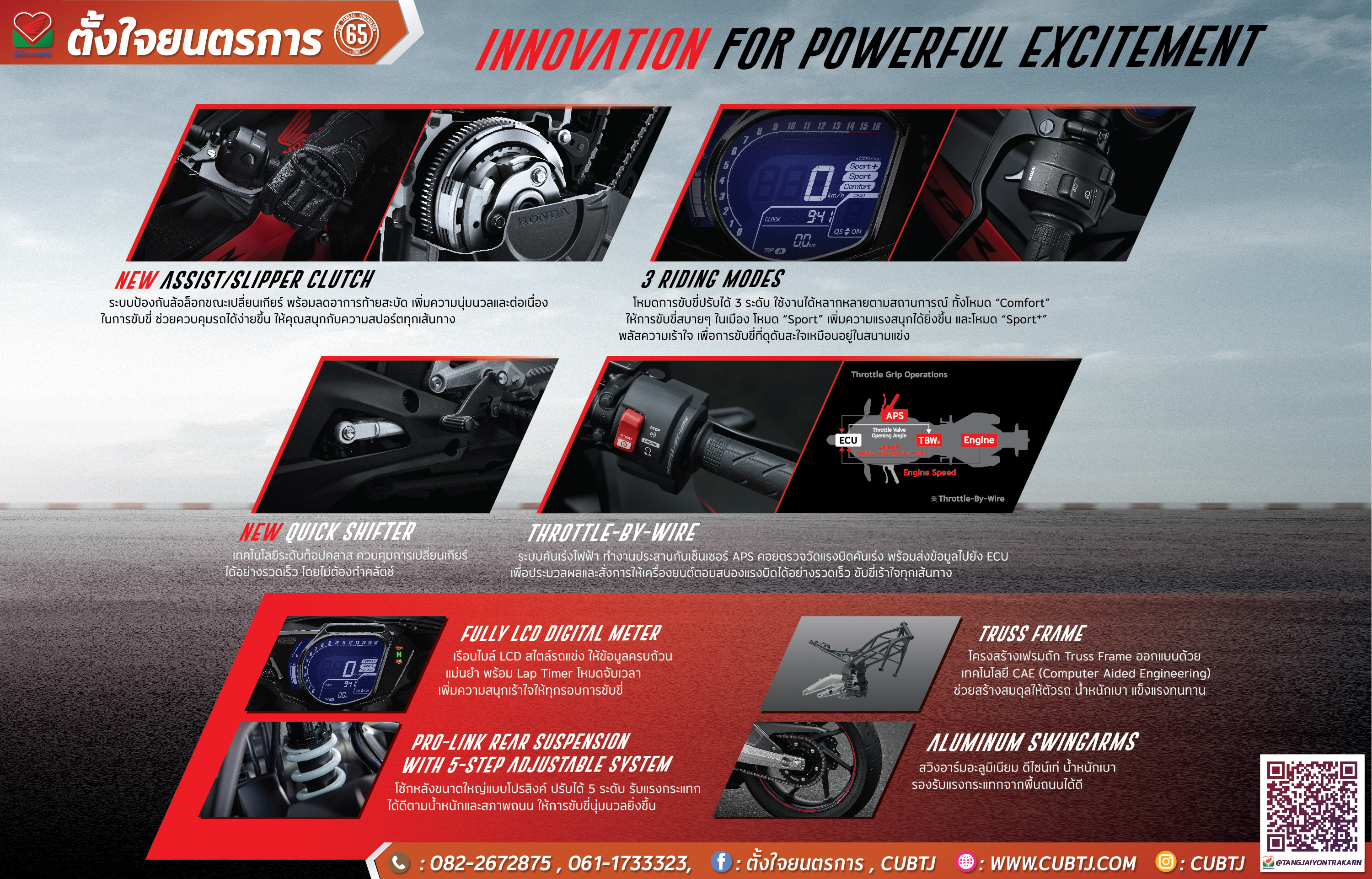 เร่งทะยานสู่โลกของความแรง ปลุกเร้า DNA สายพันธุ์สปอร์ต พร้อมเร่งทะยานสู่โลกของความแรง ไปกับ New Honda CBR250RR SP วิถีแห่งนักแข่งตัวจริงที่ส่งตรงเทคโนโลยีล้ำสมัยจากสนามแข่ง มาพร้อมสมรรถนะทรงพลัง ดีไซน์โฉบเฉี่ยวดุดัน ตัวรถน้ำหนักเบา ให้การขับขี่คล่องตัวและมีประสิทธิภาพ กับที่สุดแห่งการควบคุมสมบูรณ์แบบ พาคุณพุ่งไปสู่จุดหมายอย่างมั่นใจ แรงไร้ขีดจำกัด