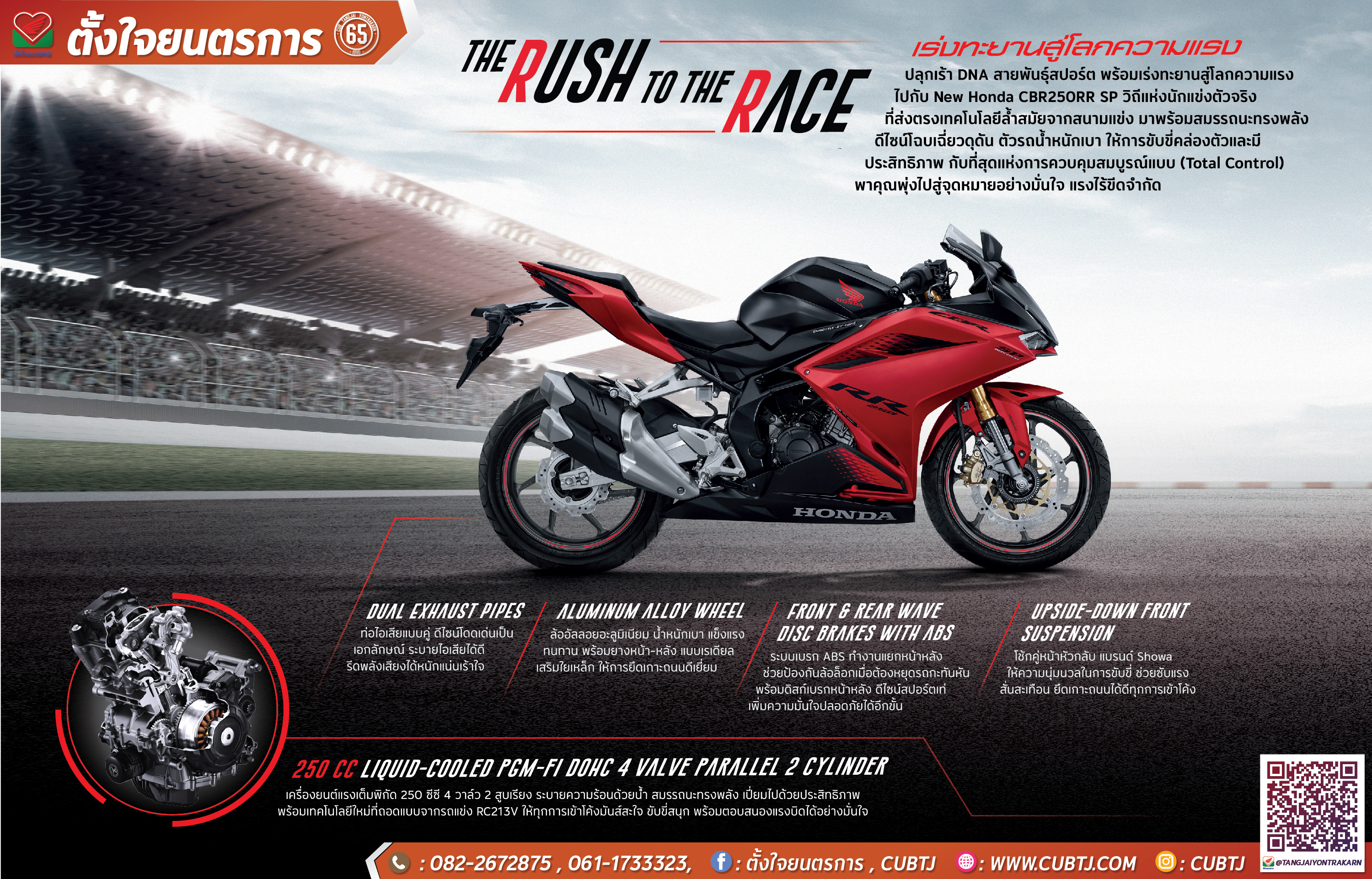 เร่งทะยานสู่โลกของความแรง ปลุกเร้า DNA สายพันธุ์สปอร์ต พร้อมเร่งทะยานสู่โลกของความแรง ไปกับ New Honda CBR250RR SP วิถีแห่งนักแข่งตัวจริงที่ส่งตรงเทคโนโลยีล้ำสมัยจากสนามแข่ง มาพร้อมสมรรถนะทรงพลัง ดีไซน์โฉบเฉี่ยวดุดัน ตัวรถน้ำหนักเบา ให้การขับขี่คล่องตัวและมีประสิทธิภาพ กับที่สุดแห่งการควบคุมสมบูรณ์แบบ พาคุณพุ่งไปสู่จุดหมายอย่างมั่นใจ แรงไร้ขีดจำกัด